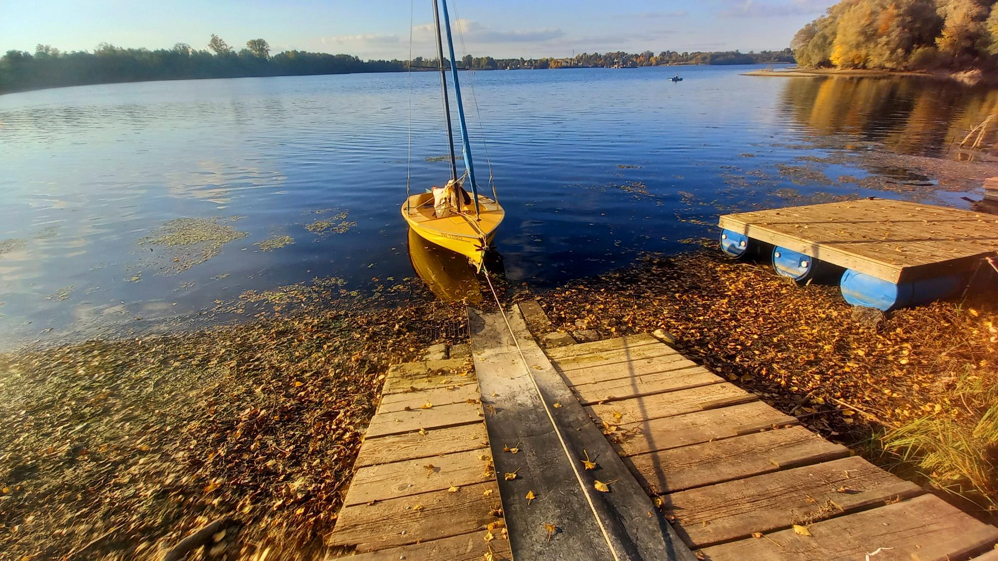 Nachdem der Baum entfernt wurde, wird die Schwimmplattform wieder zu unserem Geländeufer verlegt.